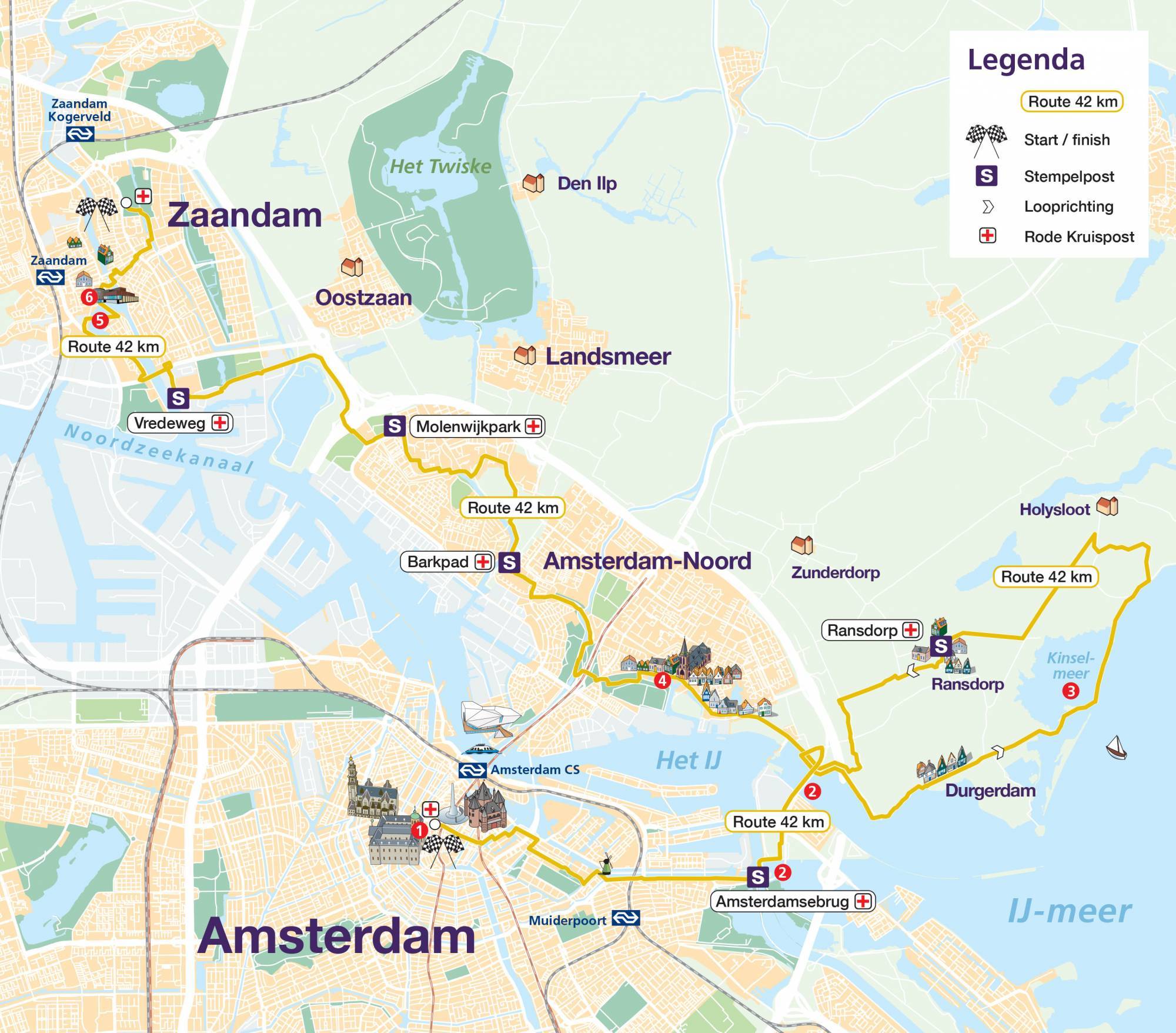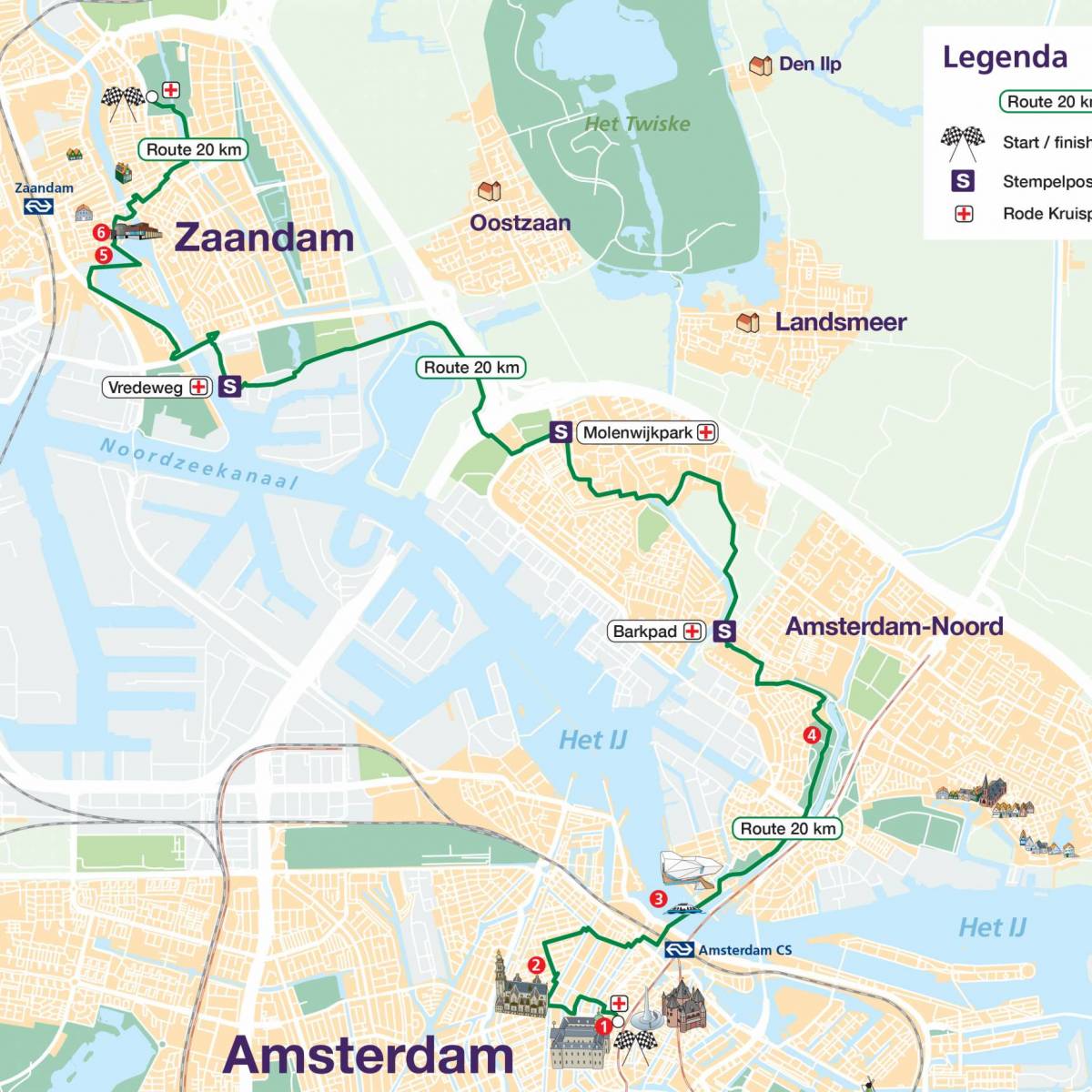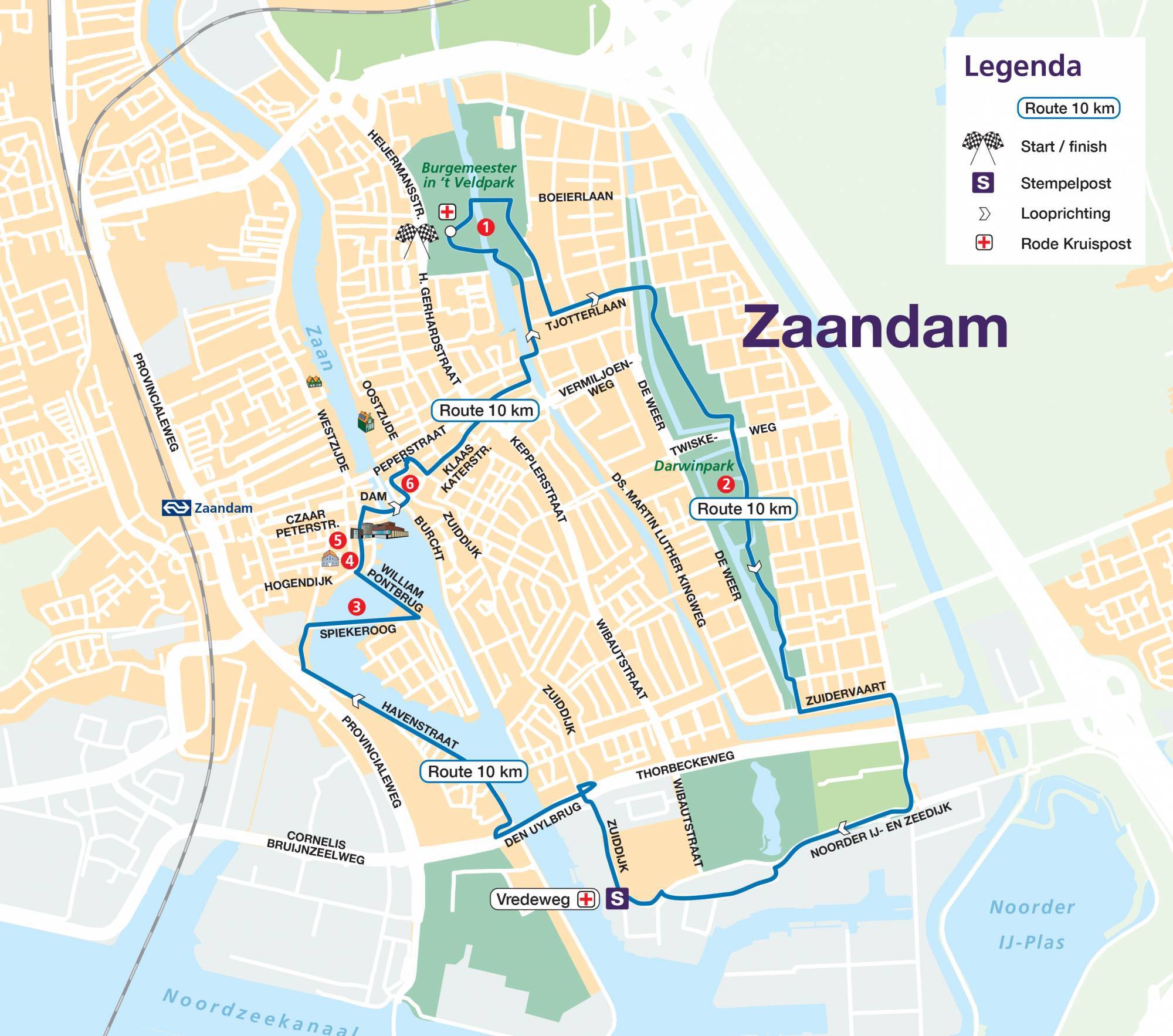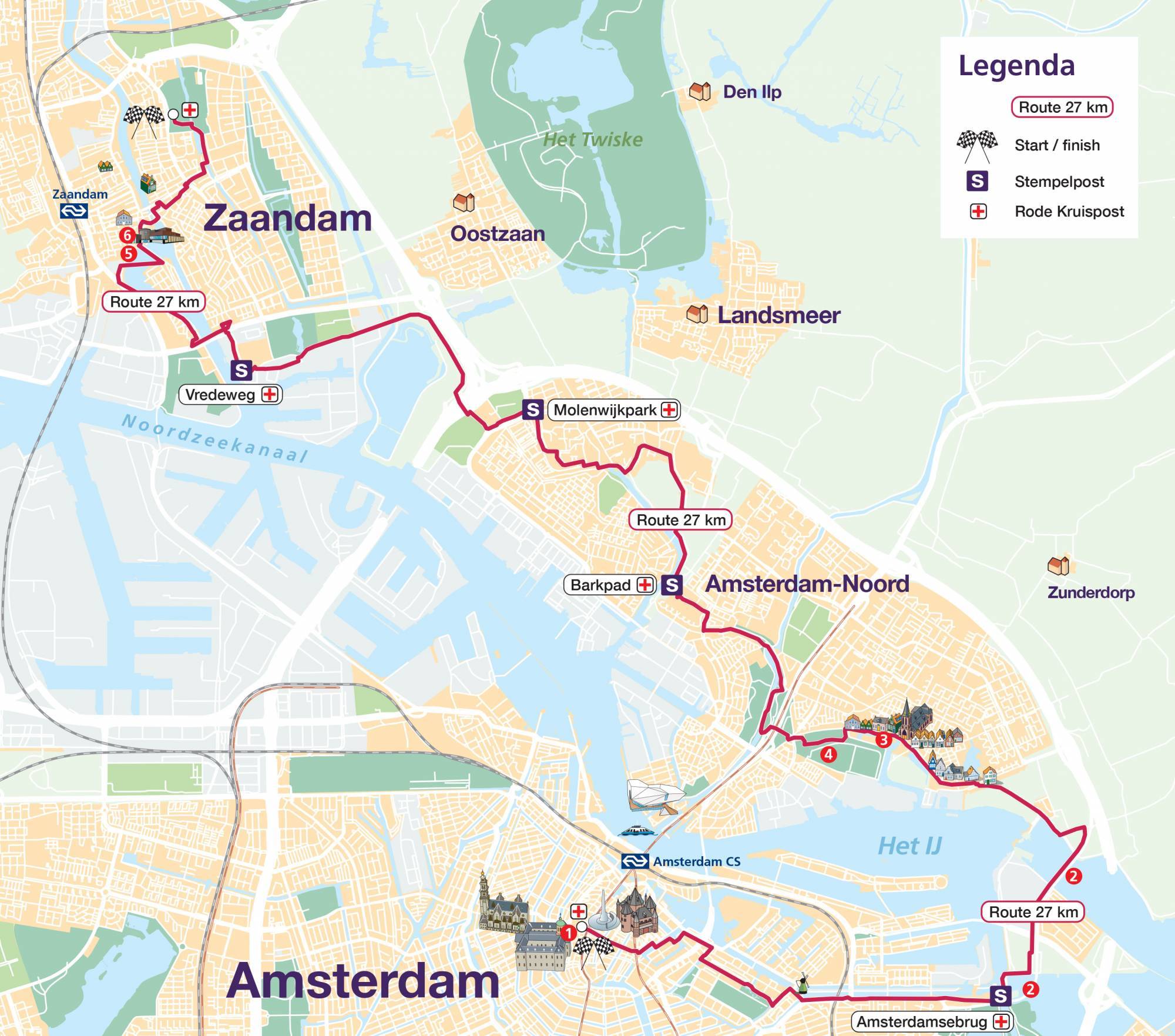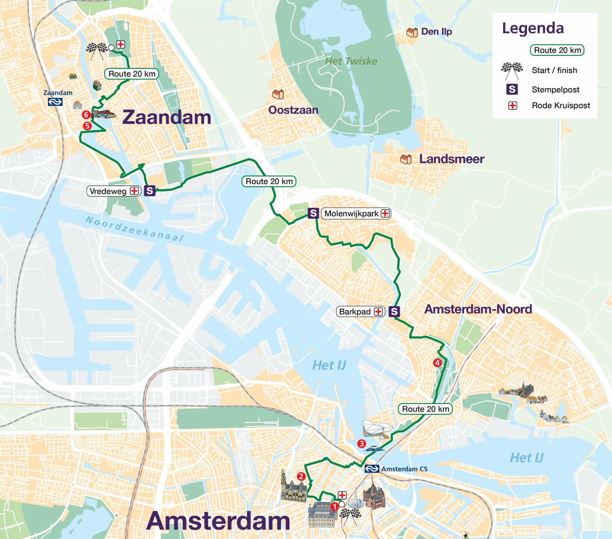 You start at the Dam tot Dam Park in Zaandam. From there you walk to Darwin Park via the Panneroodstraat. The southern part of the Darwin Park is dedicated to nature and education. Here you’ll find a school garden complex, the petting zoo Darwin Park and Nature Museum E. Heimans. In addition, along the North-South Path there are four theme gardens (woodland garden, marsh garden, grass garden and water garden) with artworks, designed by Kees Bierman. After this you continue to the Noorder IJ- en Zeedijk, where the route connects to the route of the 20, 27 and 42 km hikers. You walk the route with them via the port of Zaandam and along the Zaan. Shortly before the finish, all participants can deviate from the route for a while to visit the Czaar Peterhuisje. The finish is in the Dam tot Dam Park in Zaandam, where you’ll be welcomed with music.
